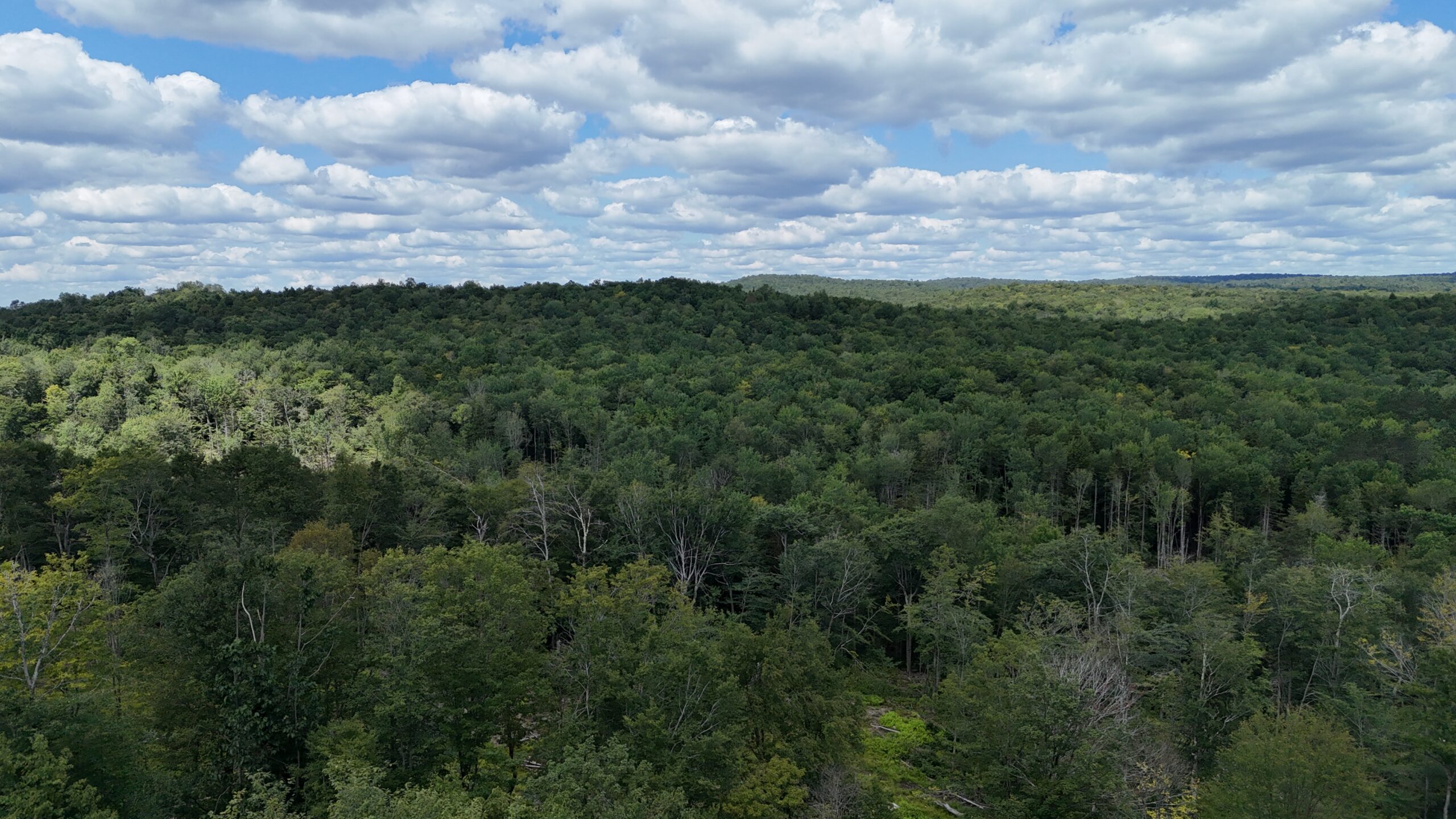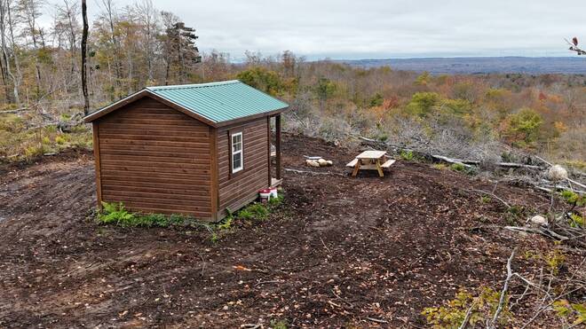 The property is accessible from Lower James Road and features a 12×16 insulated structure perched at the top of the mountain, ideal for use as a rustic base camp or an off-grid getaway. The structure is wired with lights and outlets that can be powered by a generator. From this elevated vantage point, panoramic views stretch out to the northwest, providing a stunning backdrop for outdoor adventures.