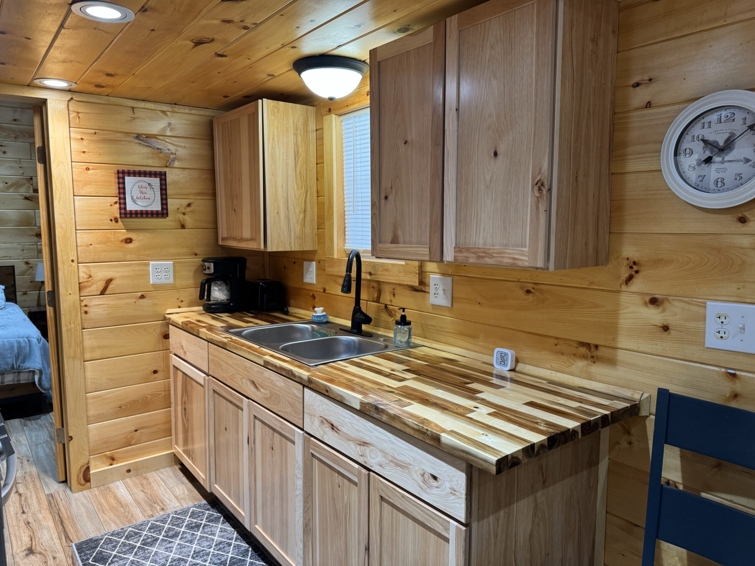 - Full kitchen with butcher block countertops and plenty of storage.