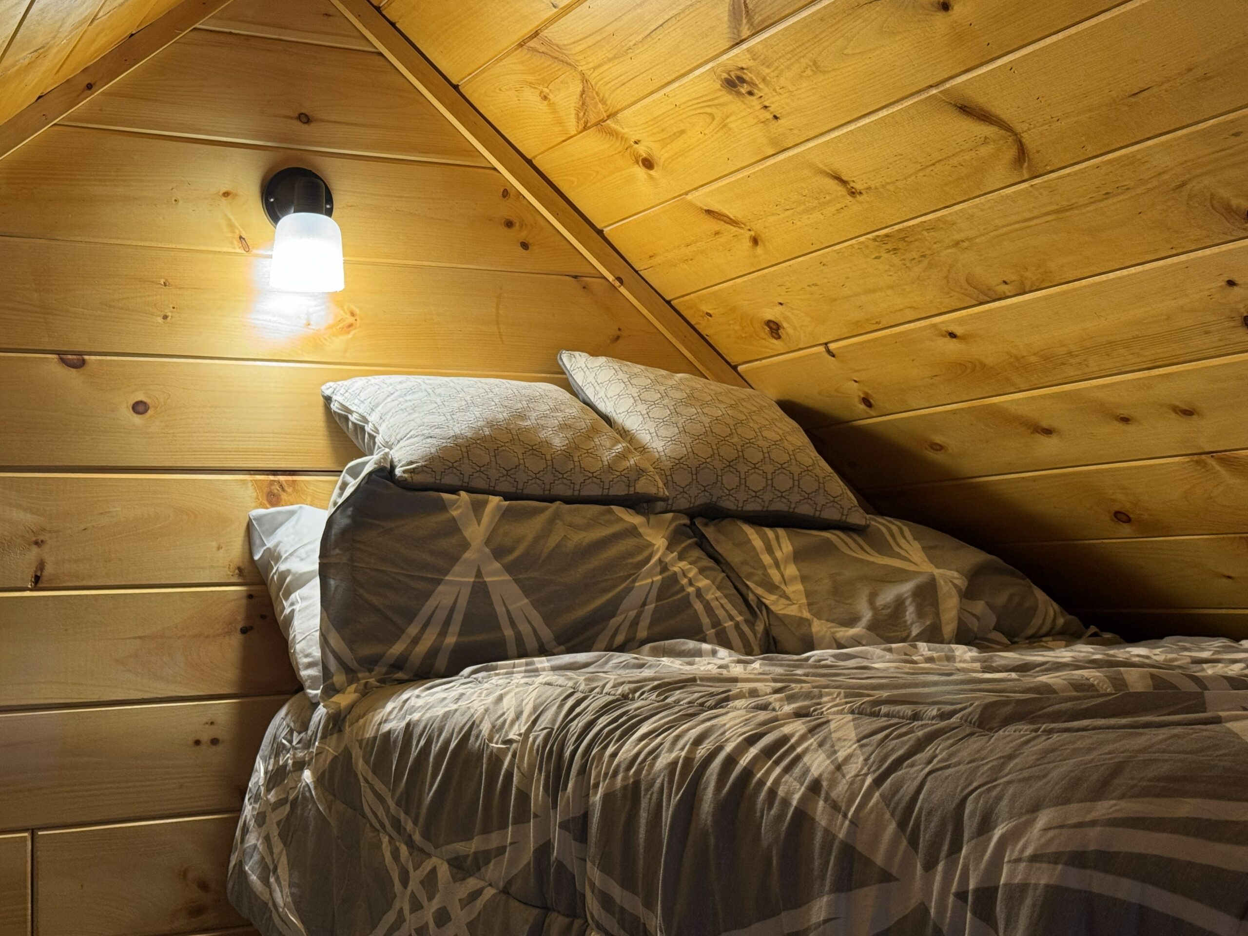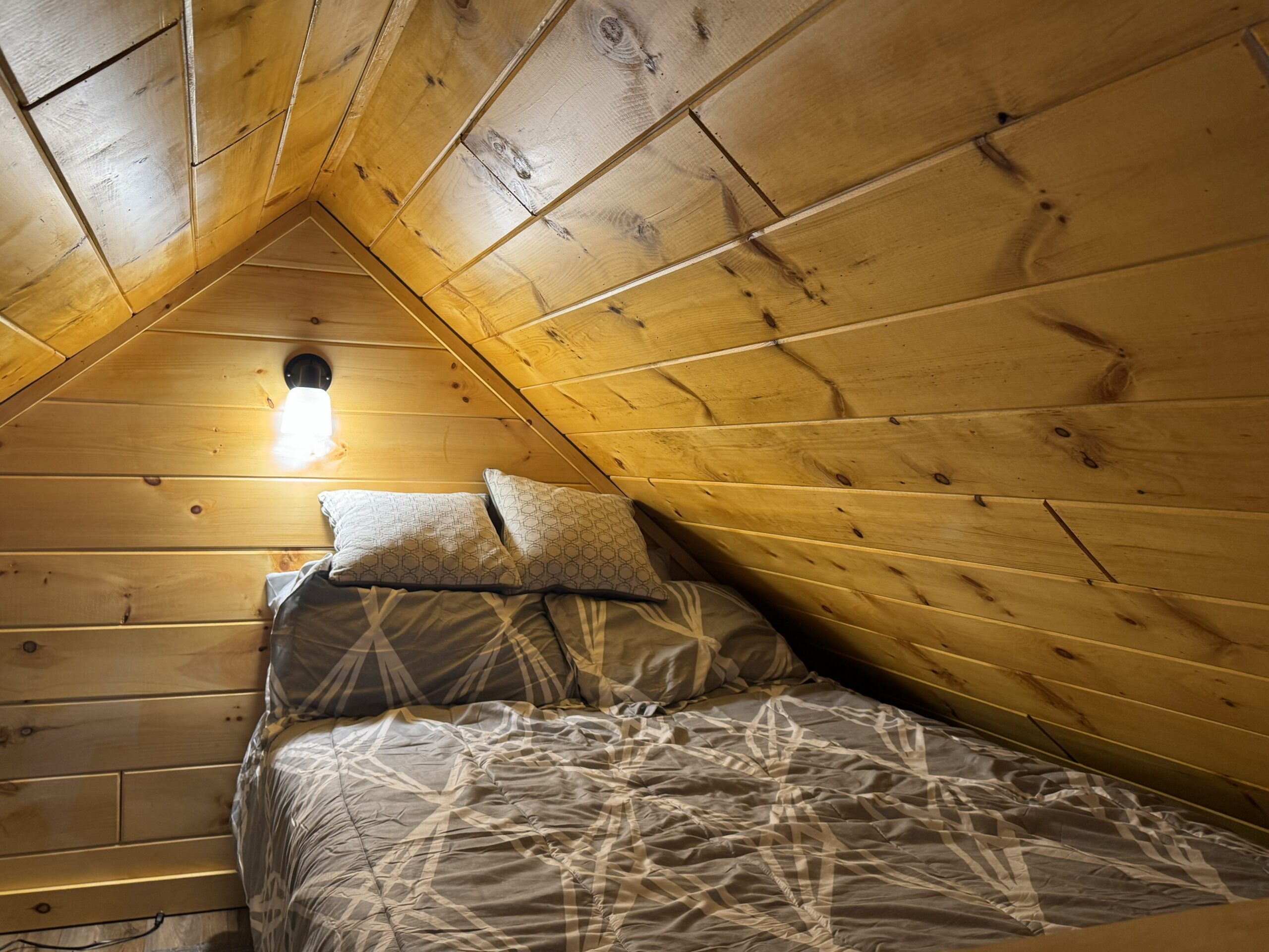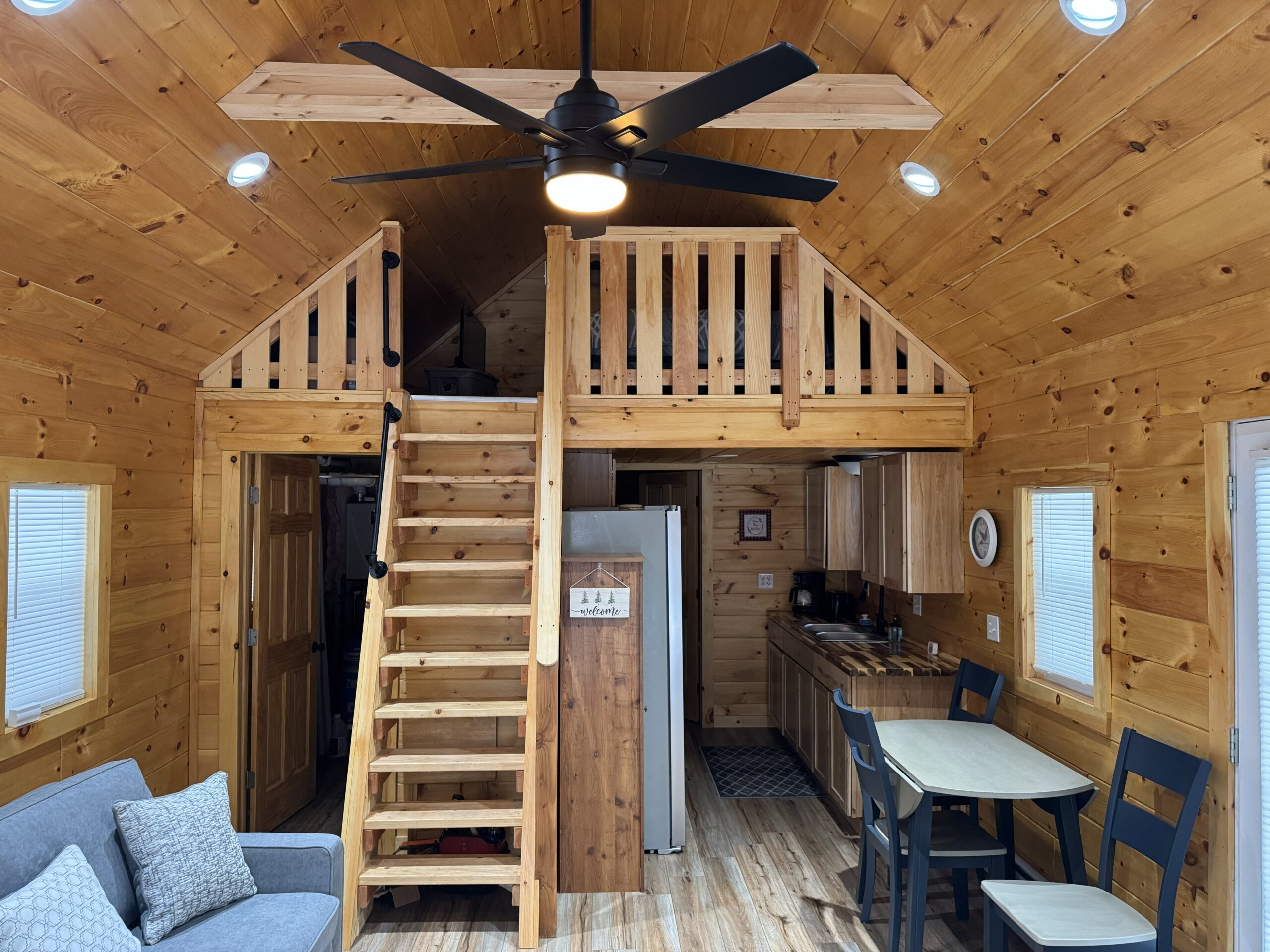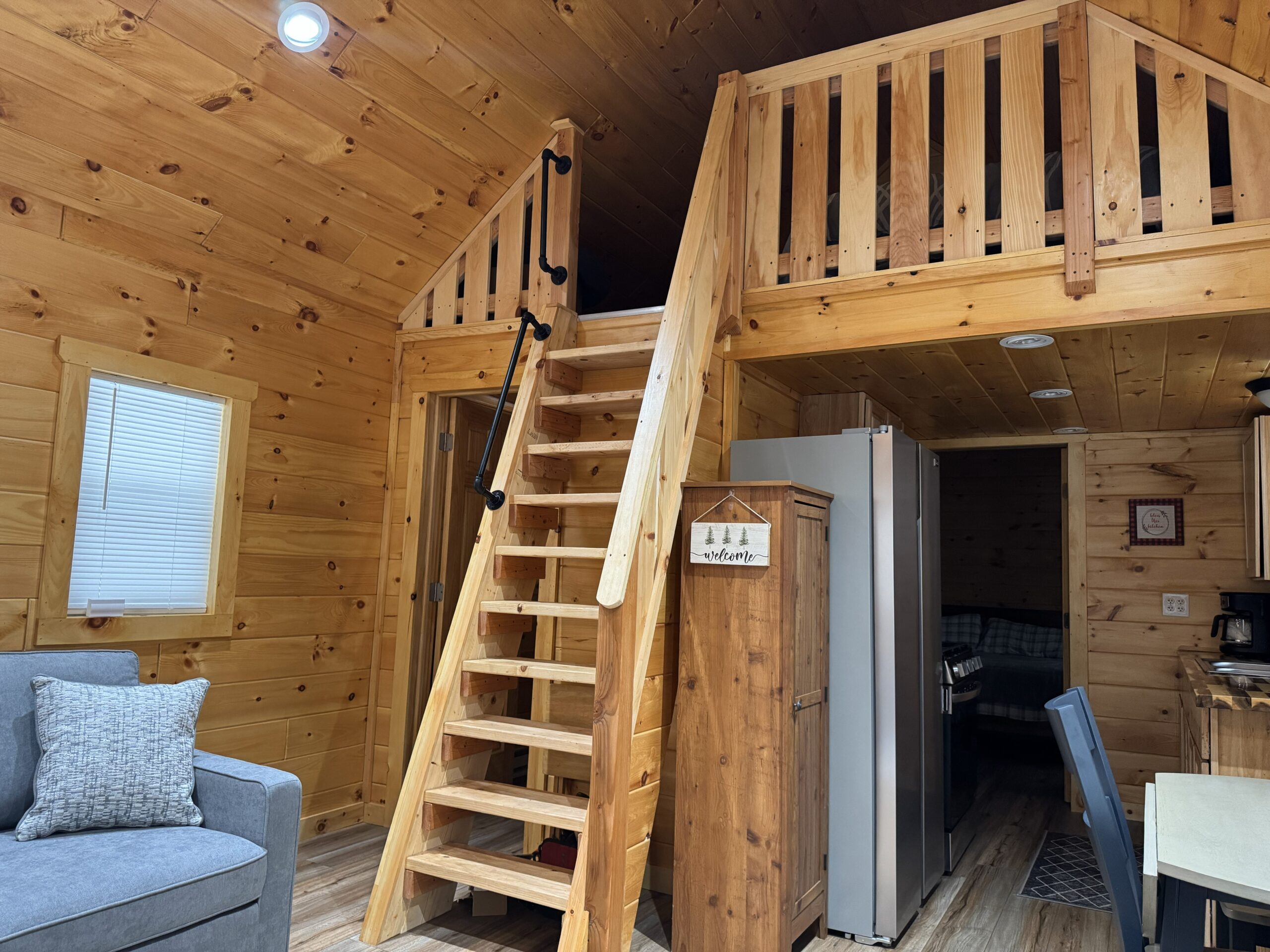 - Warm and inviting interior, featuring knotty pine walls, an open living area, and a loft large enough for a full bed.