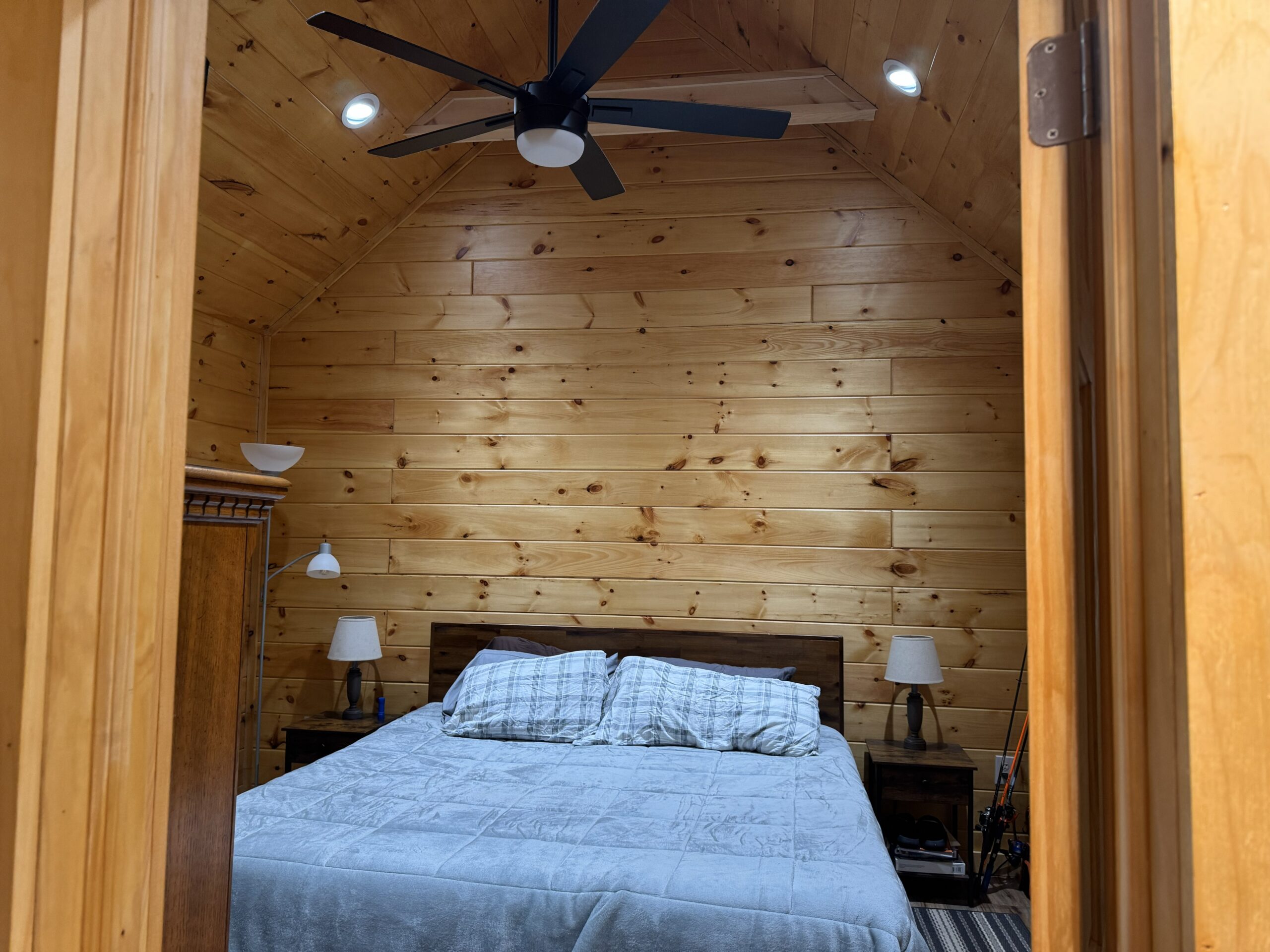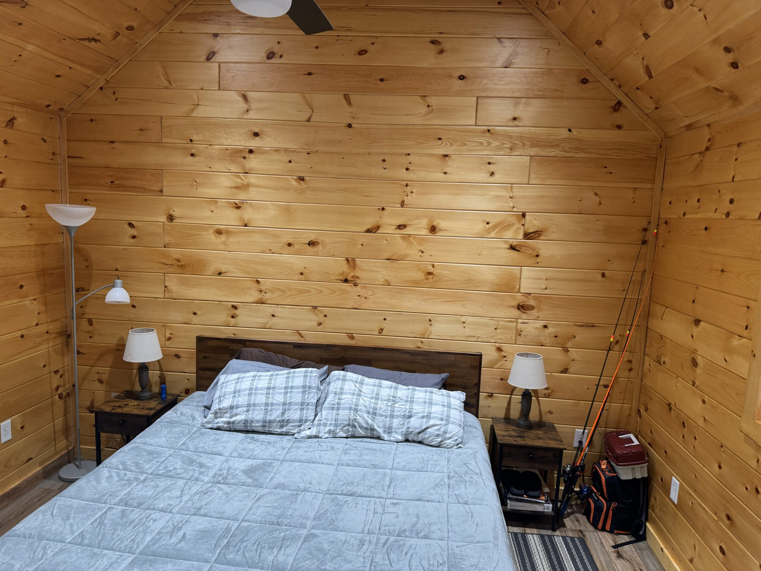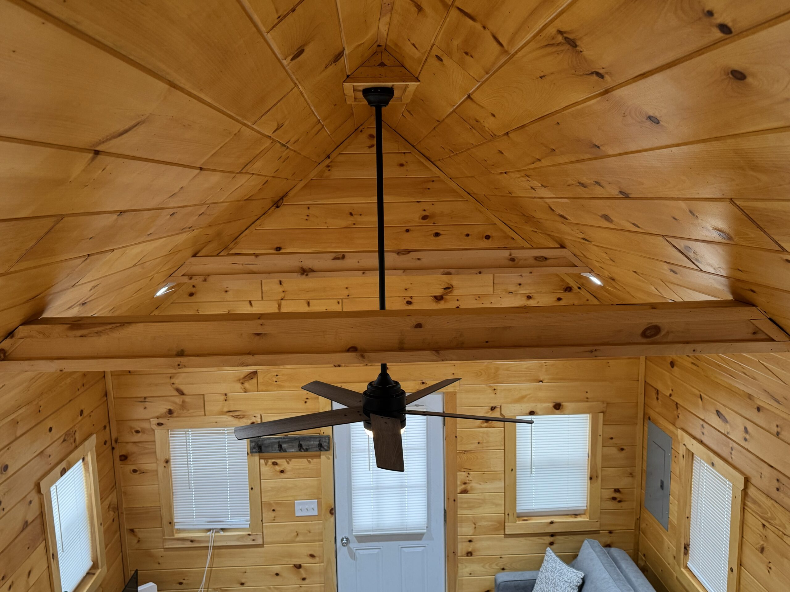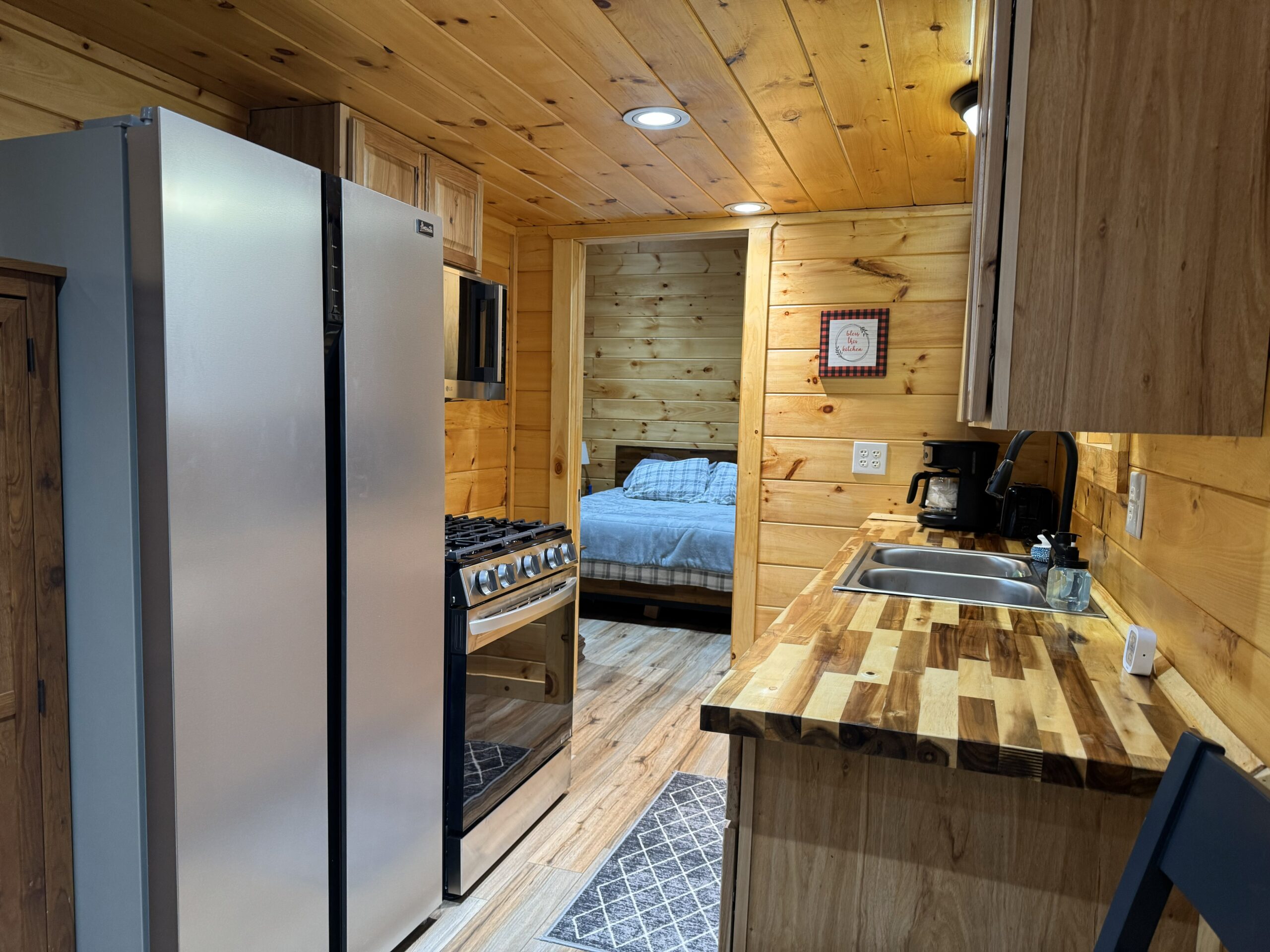 - Warm and inviting interior, featuring knotty pine walls, an open living area, and a loft large enough for a full bed.