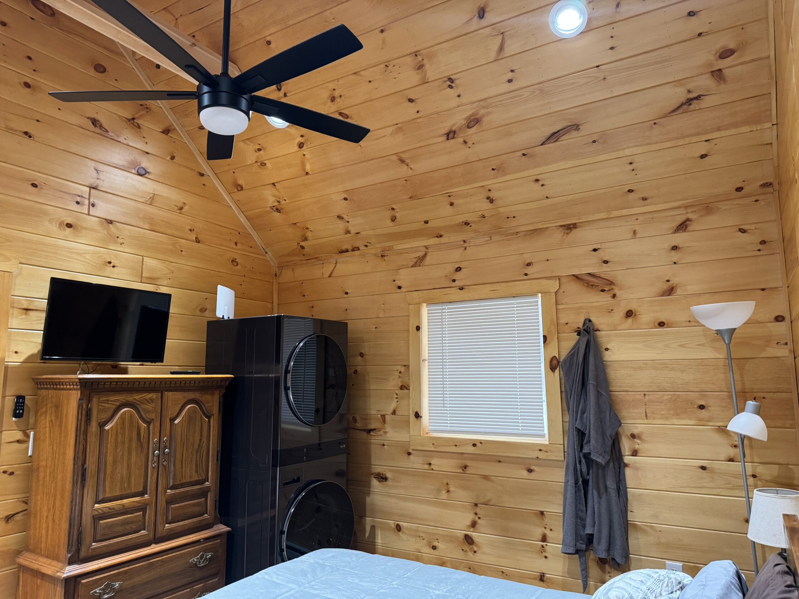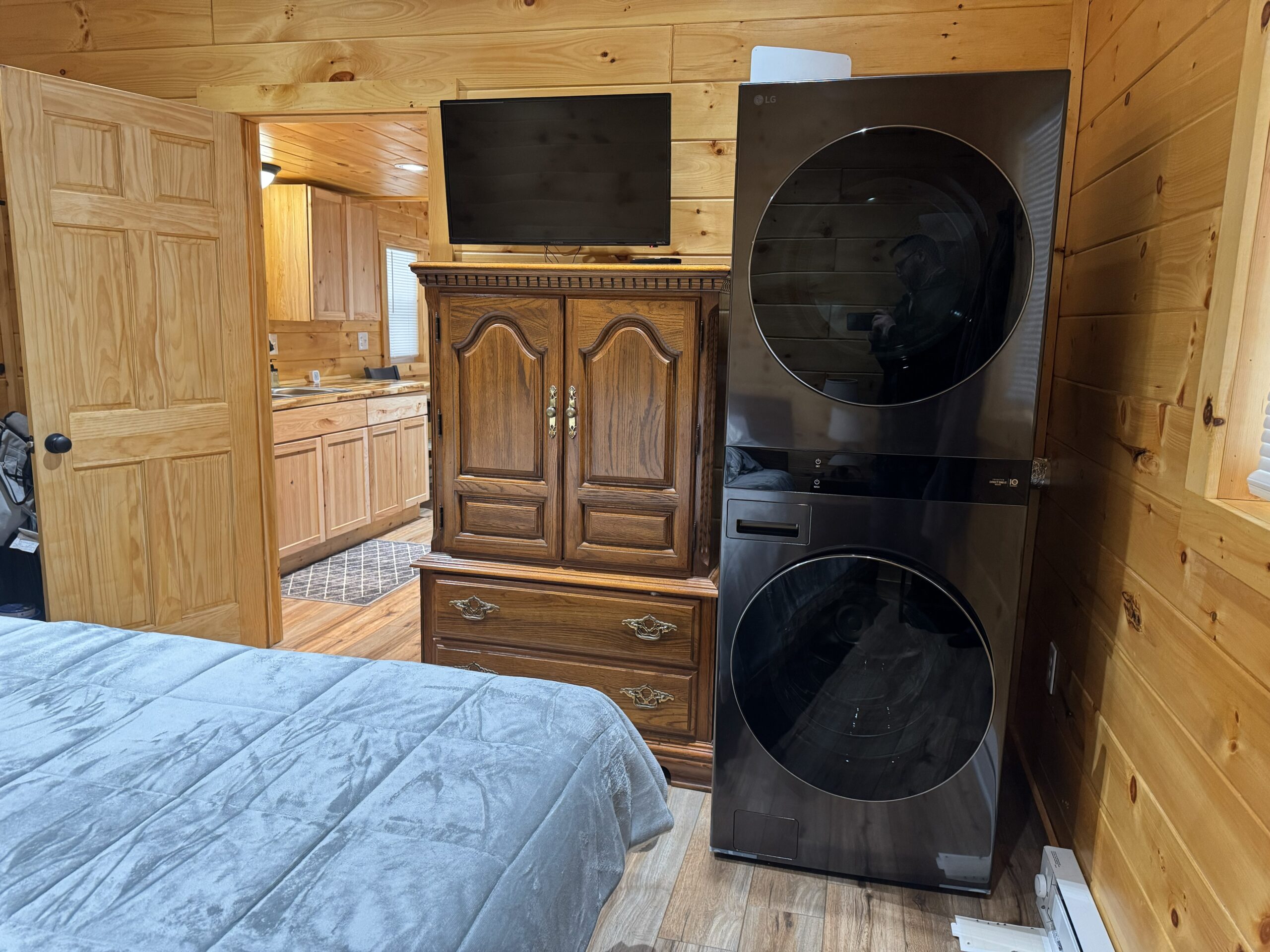 - Spacious bedroom at the rear of the cabin with stackable washer and dryer for convenience.