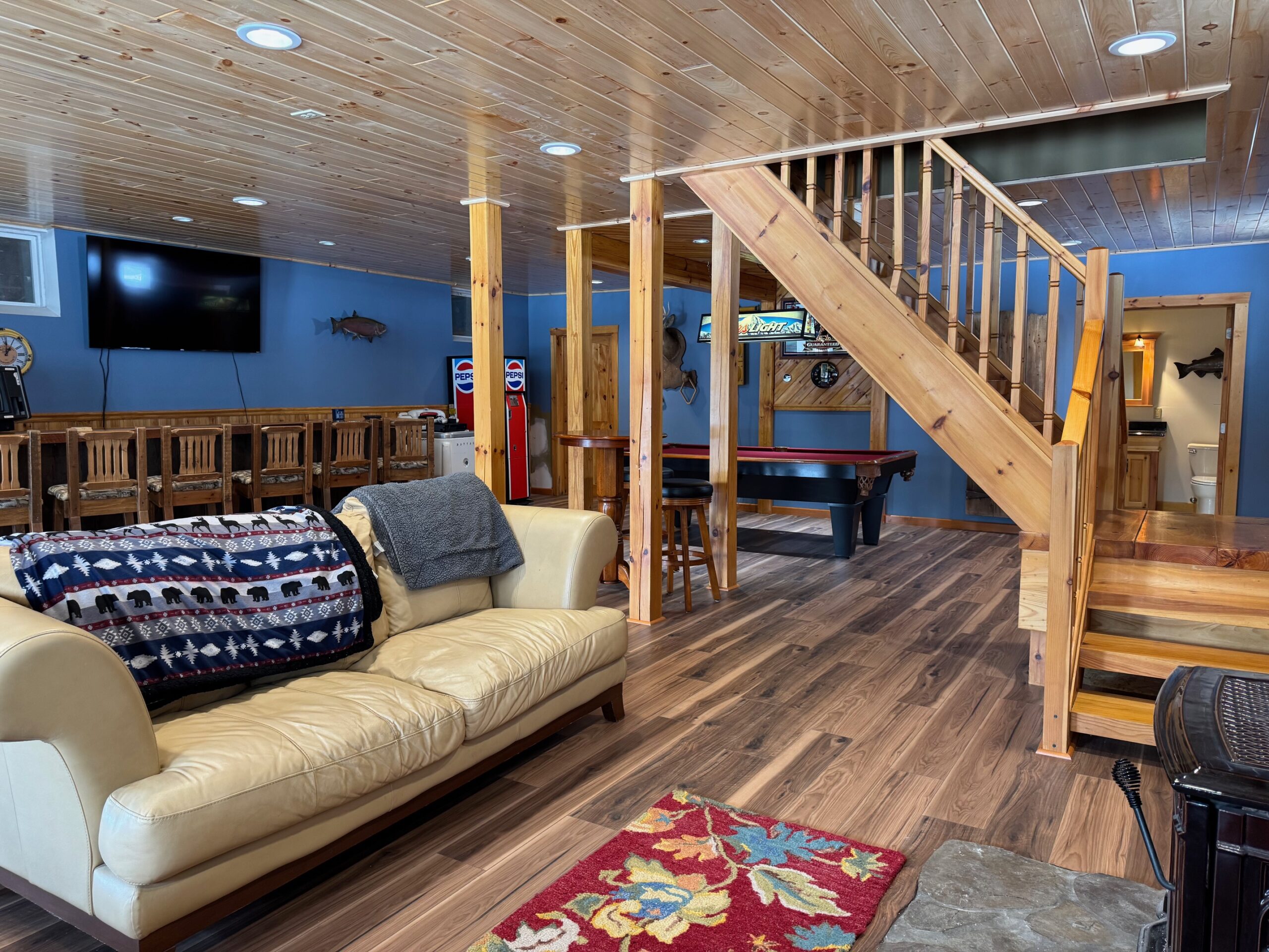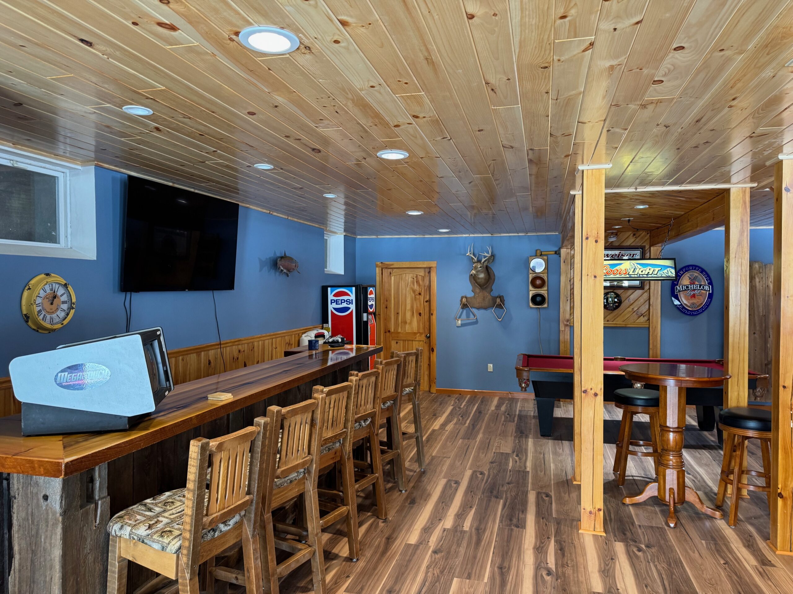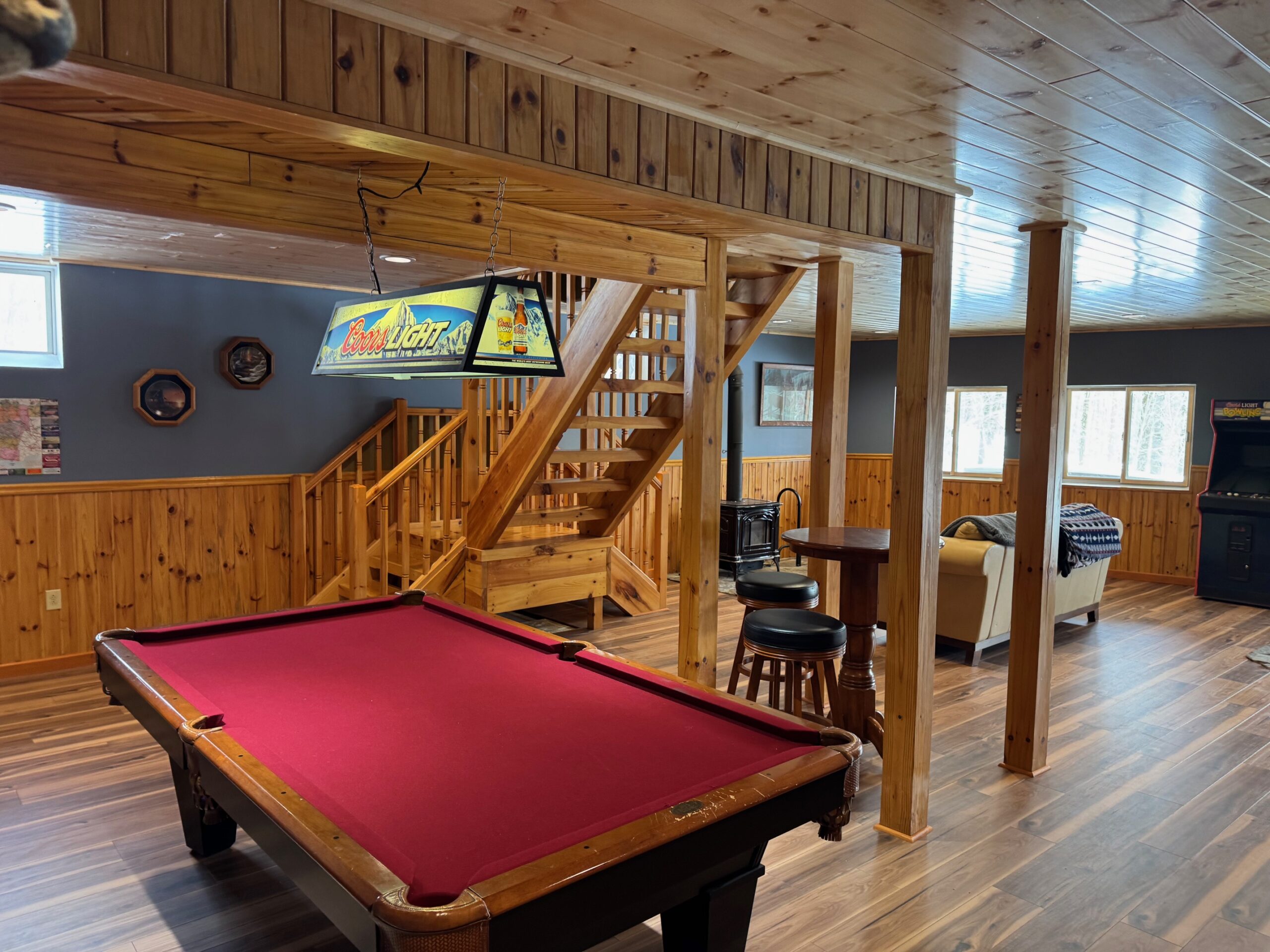 Downstairs, the finished basement is designed for entertaining, complete with a bar, pool table, wood stove, full bathroom and walkout access to a patio with jacuzzi. A large, covered porch and deck provide the perfect place to relax and take in the tranquil setting.