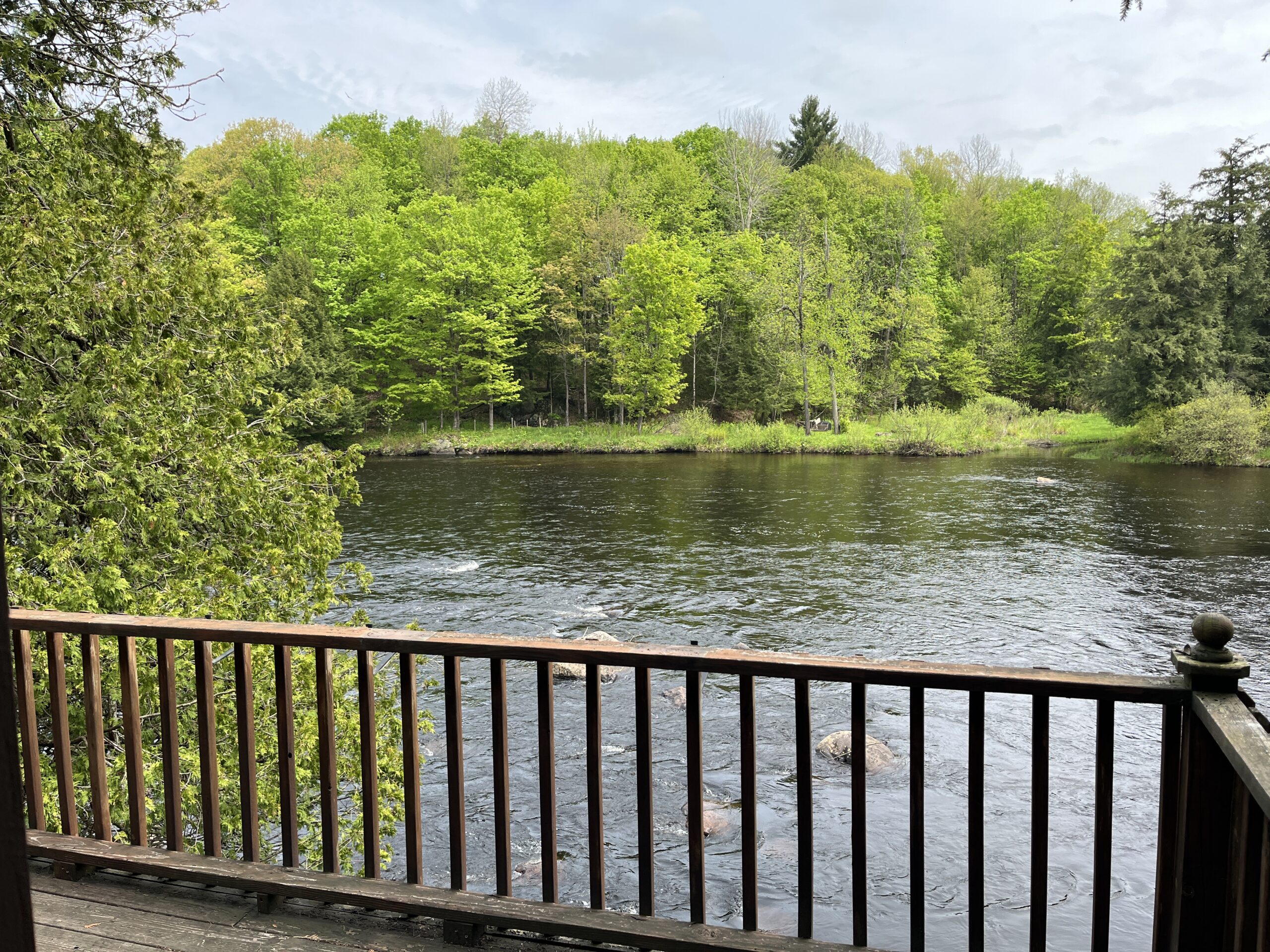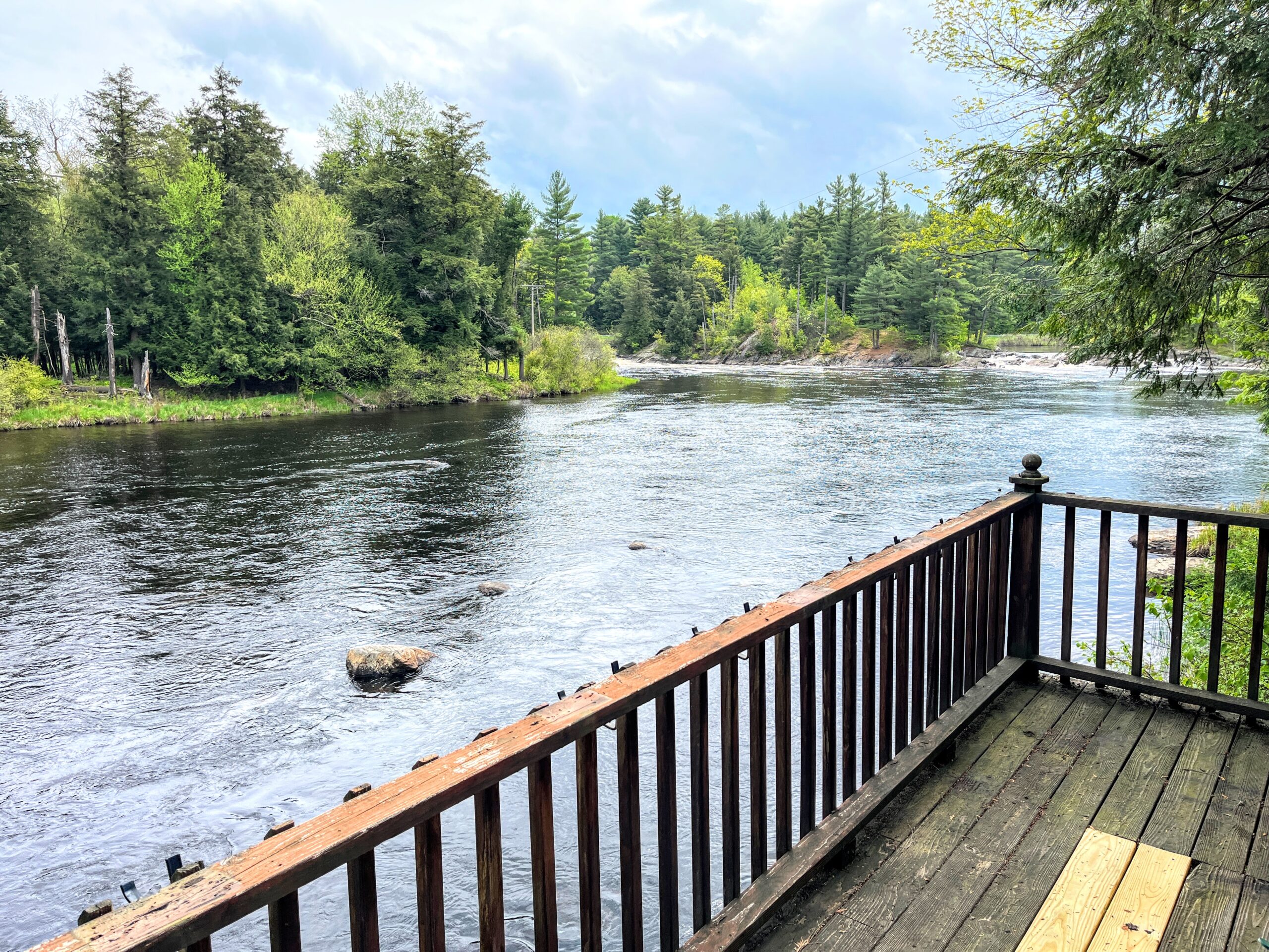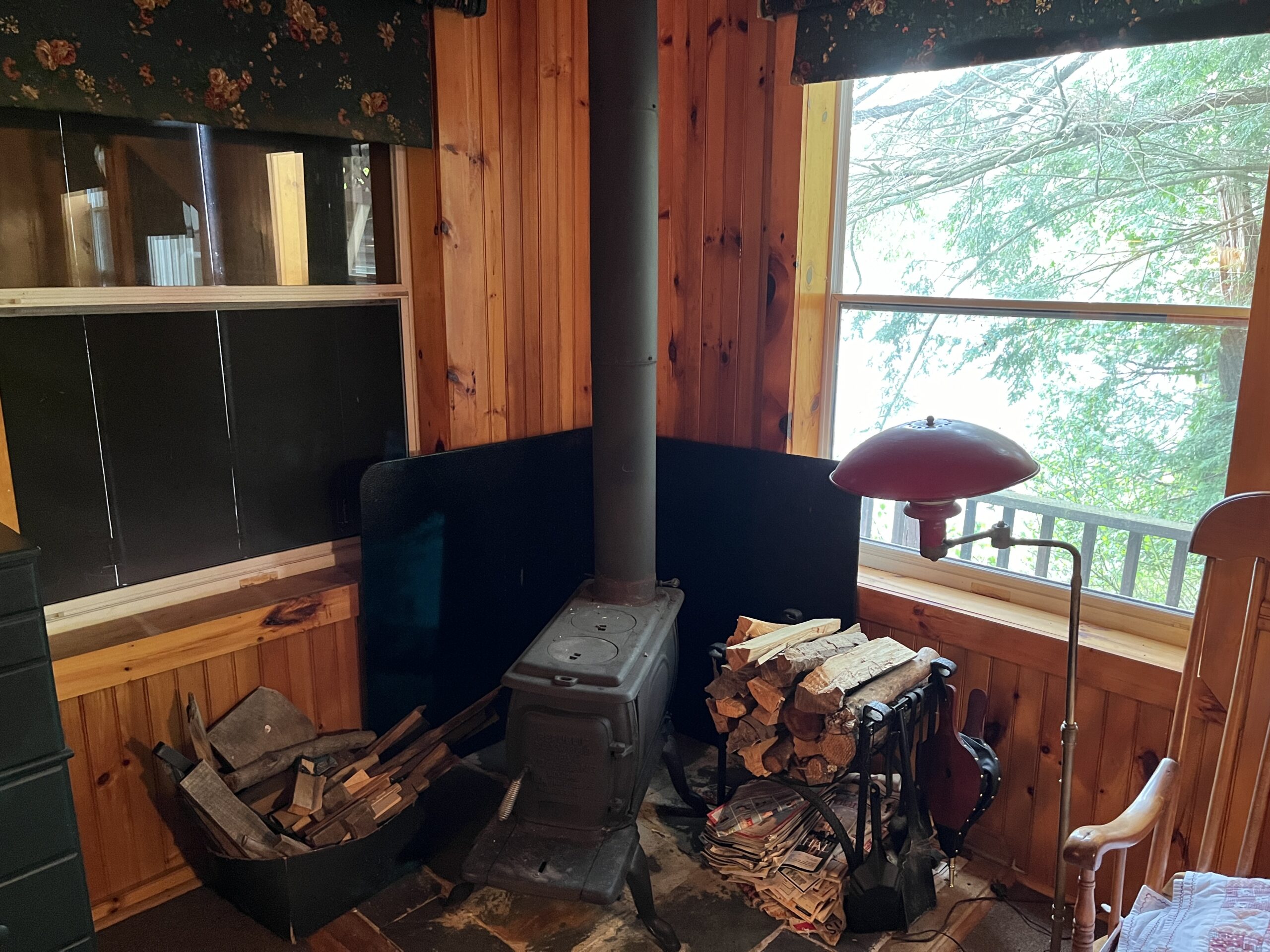 The property includes an older camper/trailer with a living room addition and a riverfront deck situated a few feet from the water’s edge. From the deck, you can enjoy views of Burch Falls and the soothing sounds of the river. The addition is fully finished with knotty pine and features a wood stove, perfect for chilly mornings. The camper, with its addition, is being sold as-is with all furnishings, and it has electricity. High-speed internet is available at the road. Please note that the property does not have a septic system or a well; there is a holding tank for waste that is periodically pumped, and water for washing is sourced from the river.