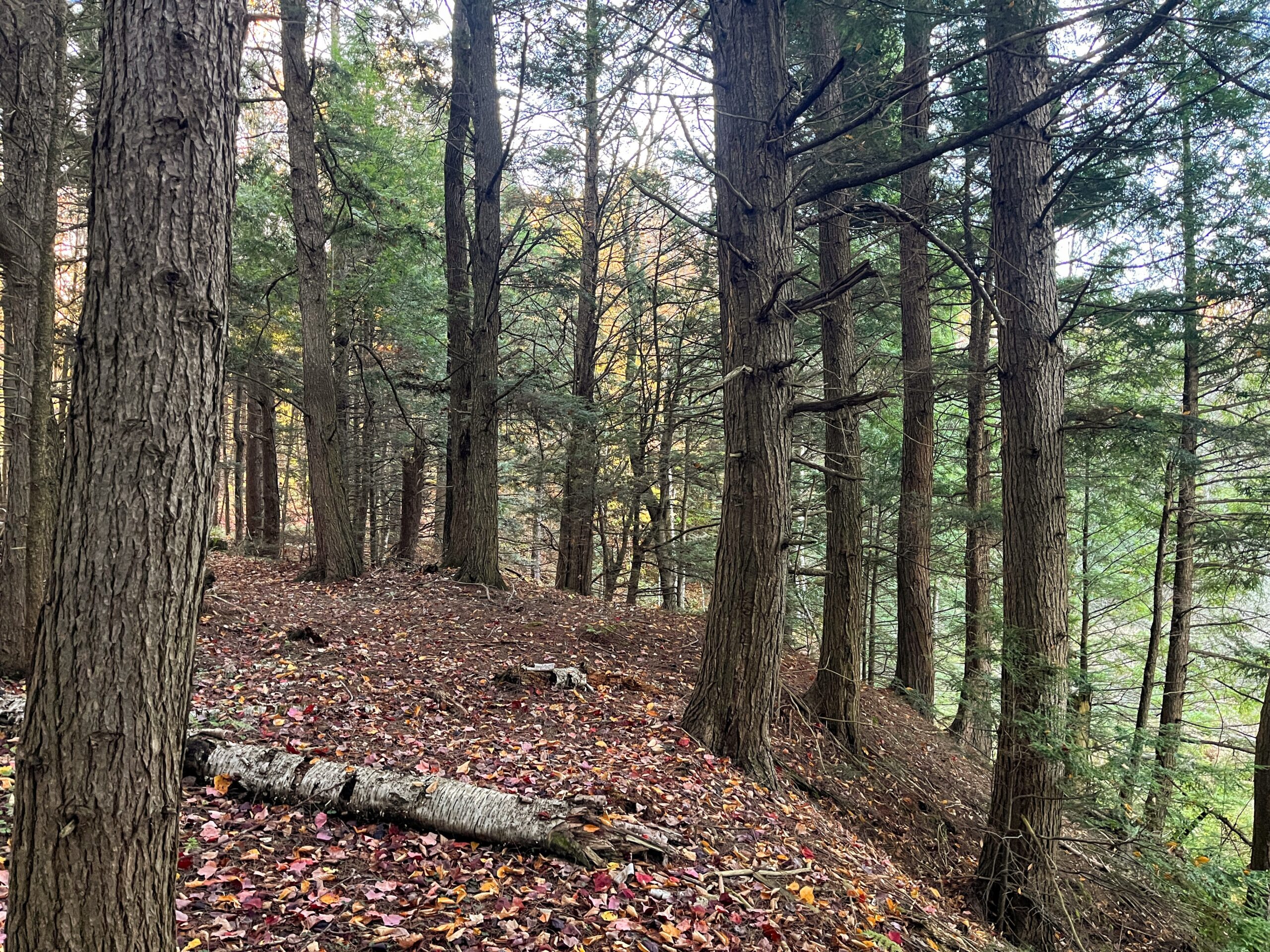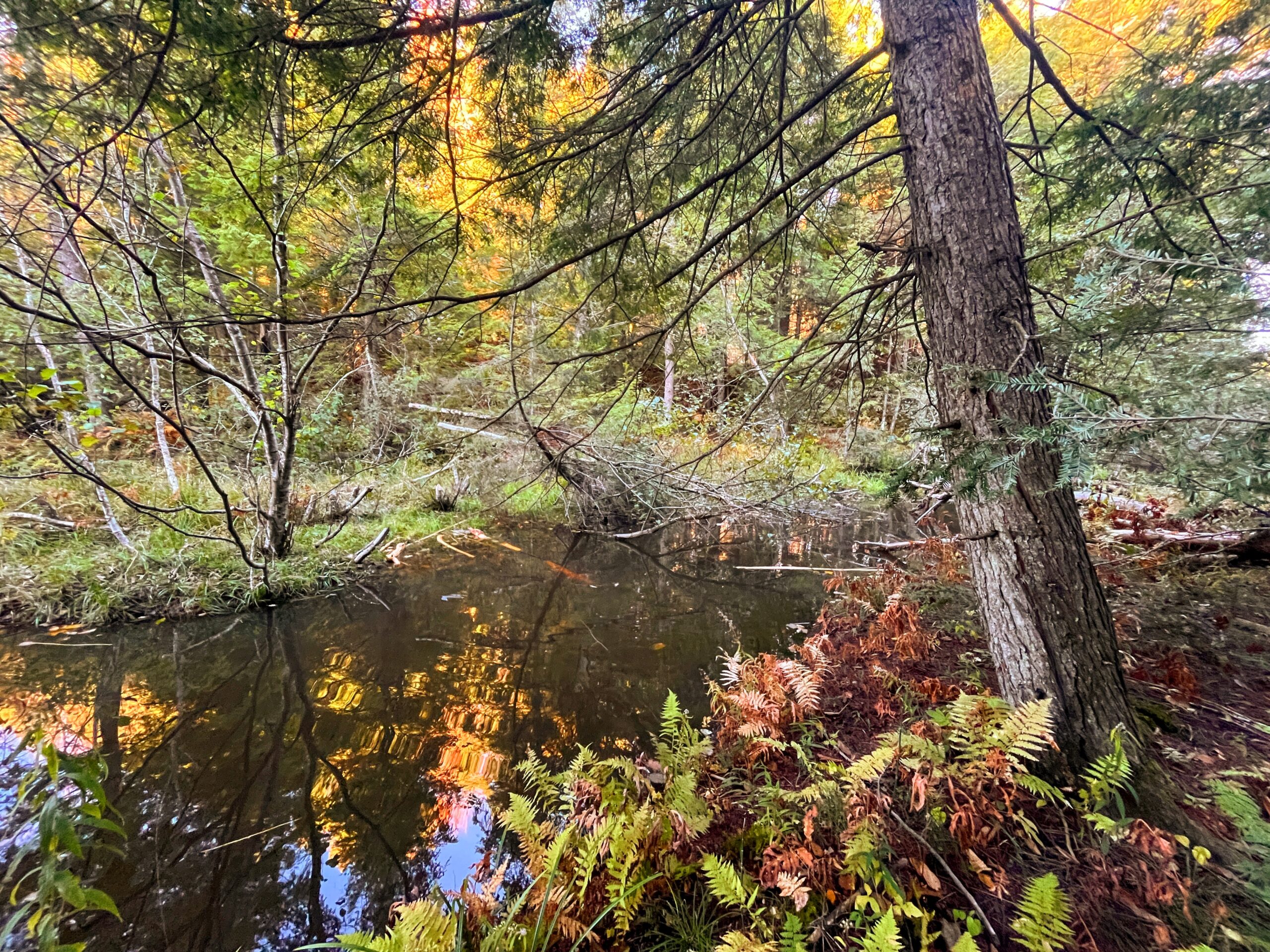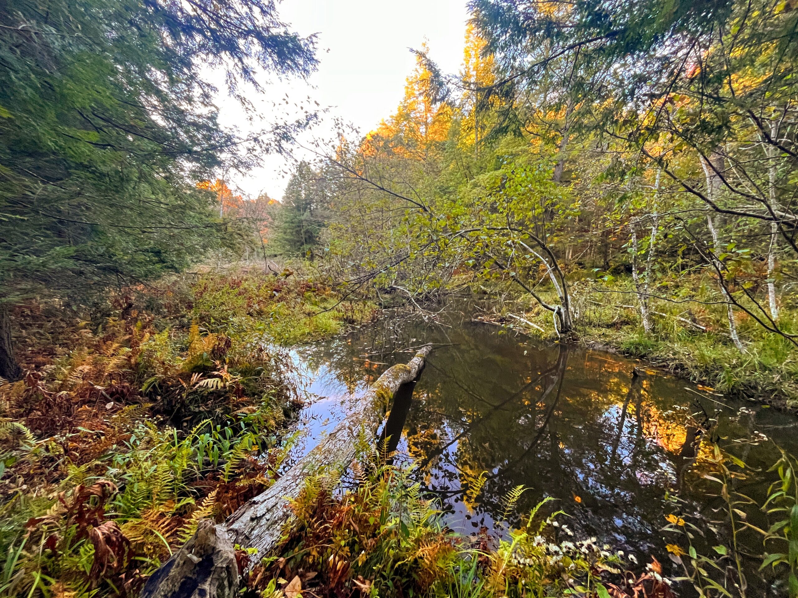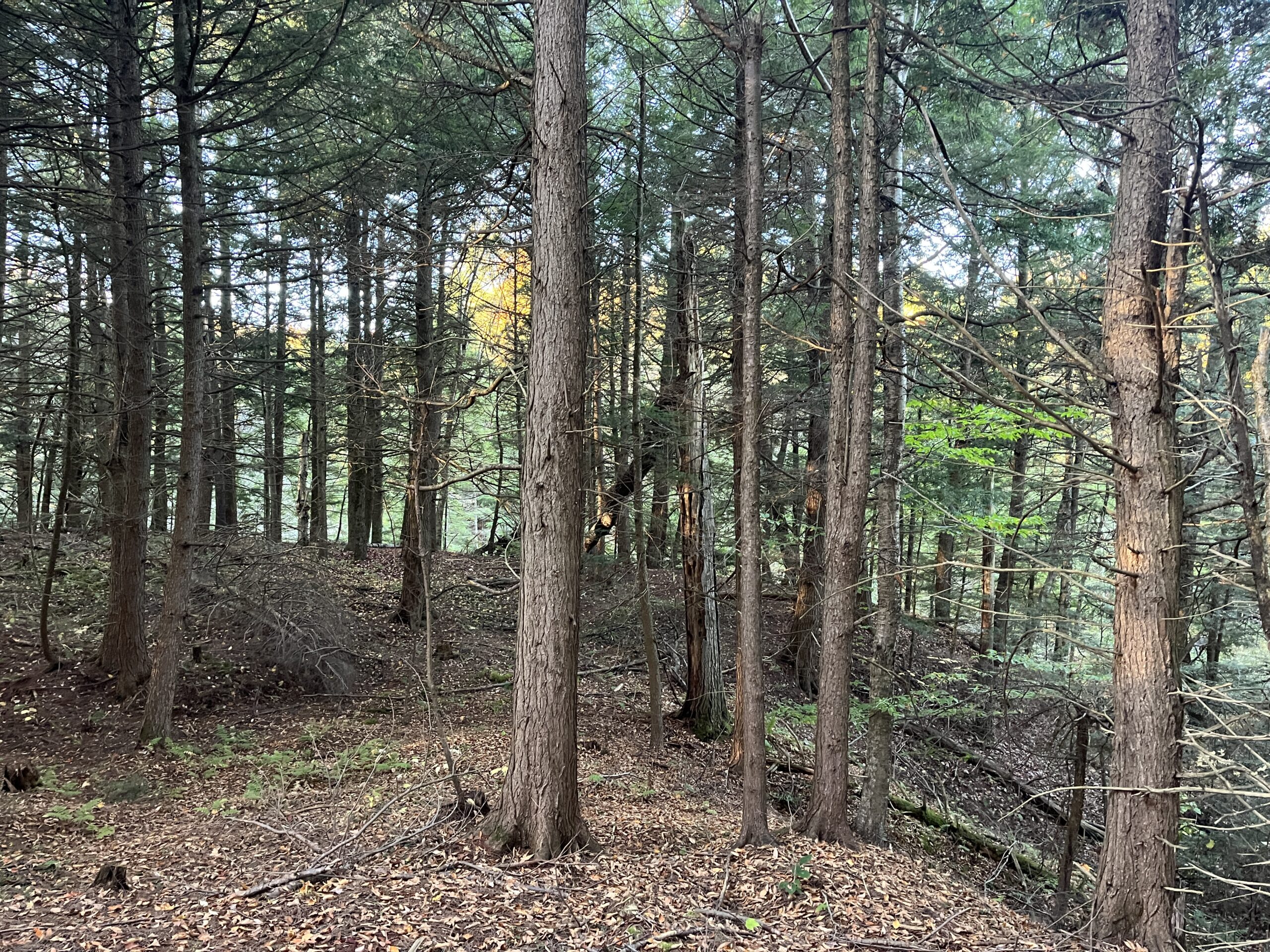 The lot features a prime location with a cleared building site and an approved building permit for an 18 x 26 cabin. Mature hemlock and hardwood trees are abundant, giving the property a park-like feel. Additionally, the western edge of the property boasts over 500 feet of frontage on Sawyer Creek, a woodland trout brook known for its native brook trout and serene atmosphere perfect for relaxation.